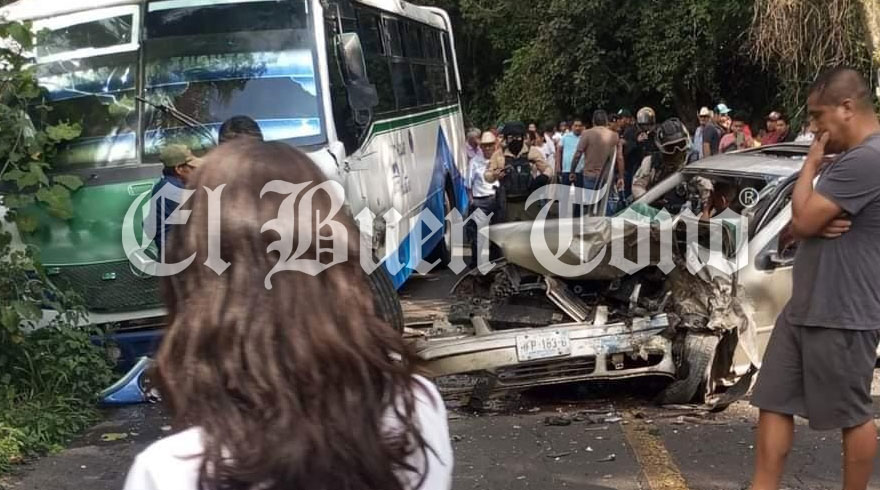 Huatusco. – Un automóvil que invadió el carril contrario, se impactó de frente contra un autobús de la línea Azules de Huatusco, al circular sobre la carretera federal a Xalapa, a la altura de la entrada al Cerro de Guadalupe.