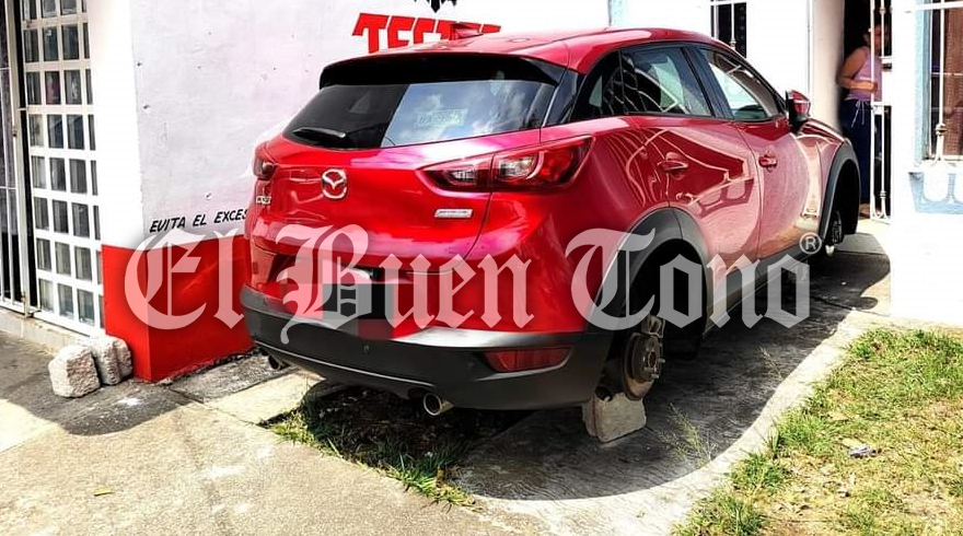 Esta mañana un caso más fue reportado de una camioneta Mazda color rojo, que estaba estacionada afuera de una vivienda, la cual amaneció sobre cuatro blocks, luego de que los ladrones se robaron las llantas.