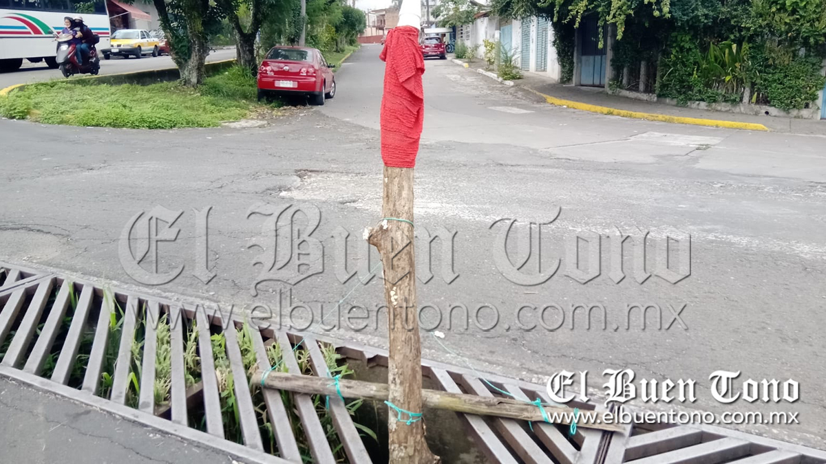 En la calle 25 y avenida 16 de la colonia San Pedro, uno de éstos desperfectos fue reportado por vecinos y peatones quienes utilizando trozos de madera, hilo y un trapo color rojo, construyeron un improvisado señalamiento en el lugar a falta del que debería ser proporcionado por la autoridades.