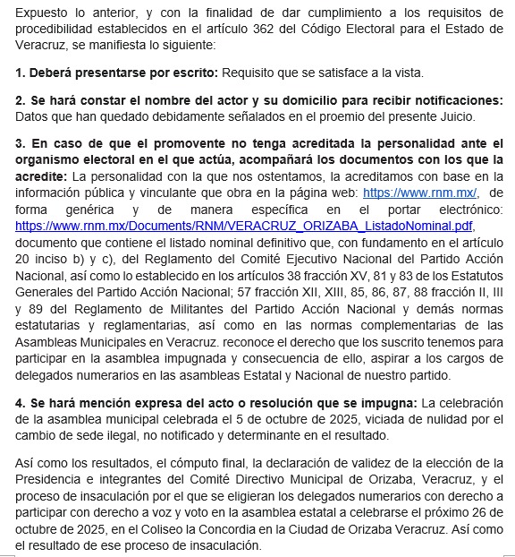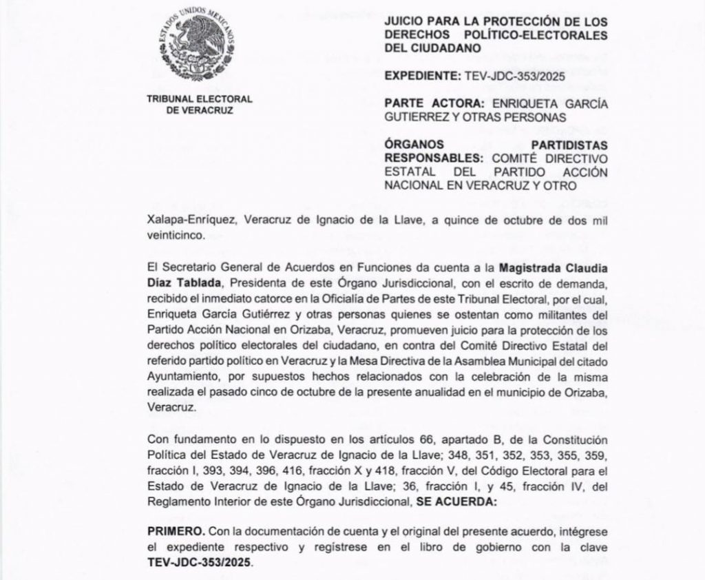 Orizaba.- El Tribunal Electoral de Veracruz (TEV) admitió una impugnación presentada por militantes del Partido Acción Nacional (PAN) en Orizaba, bajo el expediente TEV-JDC-353/2025; denunciaron irregularidades en la asamblea municipal celebrada el pasado 5 de octubre, tras un cambio de sede de última hora que, aseguran, afectó el desarrollo de la votación.