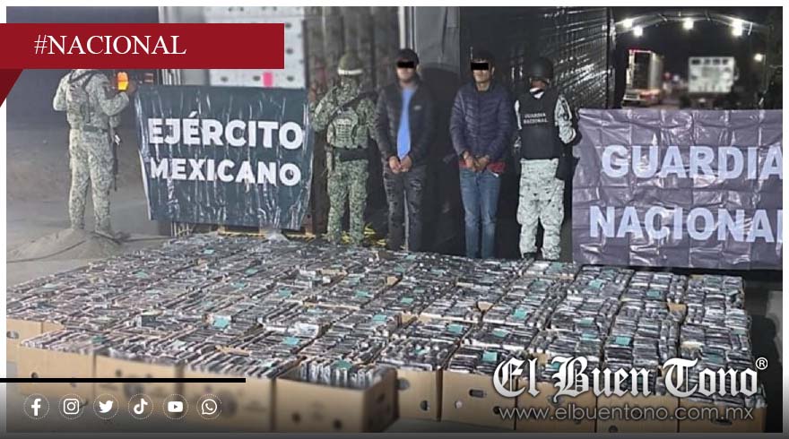 En las imágenes difundidas por la Secretaría de Seguridad se observa a los detenidos junto a elementos de la Guardia Nacional y la Secretaría de la Defensa Nacional, mientras en el suelo permanecen cajas de cartón que simulaban transportar alimentos, pero que en su interior ocultaban los paquetes con la sustancia ilícita.