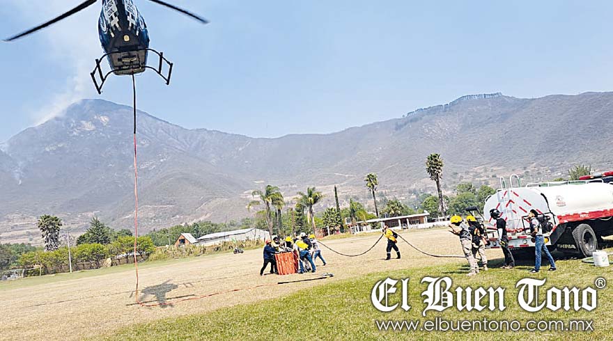 Las autoridades estatales dispusieron del helicóptero tipo Bell de la Fuerza Civil para regar con el Bambi Bucket y rociar con agua el lugar, pero no ha sido posible apagarlo.