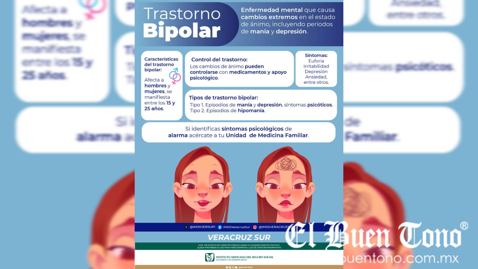 La Jefatura de Prestaciones Médicas señaló que, el trastorno bipolar es una enfermedad mental que afecta al cerebro y se caracteriza por generar cambios emocionales extremos: altos emocionales (manía o hipomanía) y bajos emocionales (depresión).