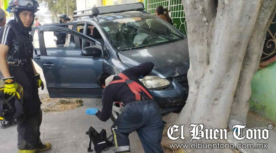 Trascendió que el conductor de la motocicleta intentó rebasar en sentido contrario, ocasionando que la conductora del auto azul perdiera el control, se subiera a la banqueta y chocara contra un árbol.