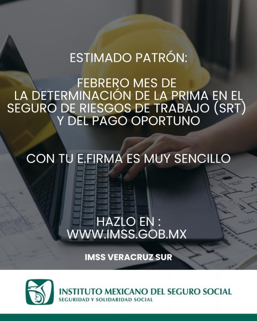 El Instituto Mexicano del Seguro Social (IMSS) en Veracruz Sur invita a los patrones a realizar la Determinación Anual de la Prima en el Seguro de Riesgos de Trabajo, el cual es un trámite que debe presentarse anualmente, específicamente durante el mes de febrero con el propósito de determinar la prima con la que habrán de cubrir las cuotas en el Seguro de Riesgos de Trabajo, se toma como base para el cálculo los riesgos de trabajo ocurridos a sus trabajadores durante el ejercicio de revisión.