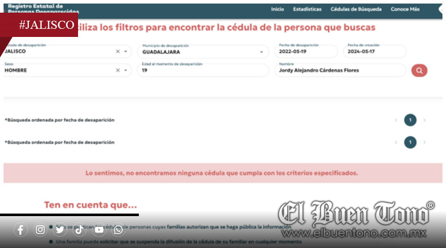 Un ejemplo es el caso de Jordy Alejandro Cárdenas Flores, desaparecido en Guadalajara el 19 de mayo de 2022. Aunque existe una cédula informativa de búsqueda emitida en 2024 por autoridades estatales, su nombre no aparece ni en el registro estatal ni en el nacional. La plataforma local incluso arroja un mensaje de “no encontrado”, pese a que la ficha fue expedida oficialmente.