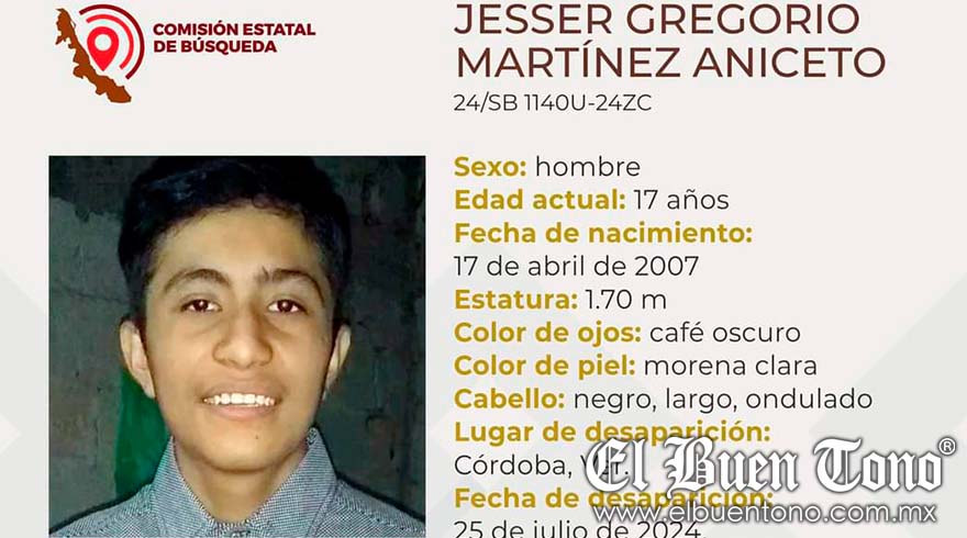 Córdoba.- Un adolescente de 17 años, de nombre Jesser Gregorio Martínez Aniceto, es buscado por su familia, al no saber de él desde el 25 de julio de este año.
