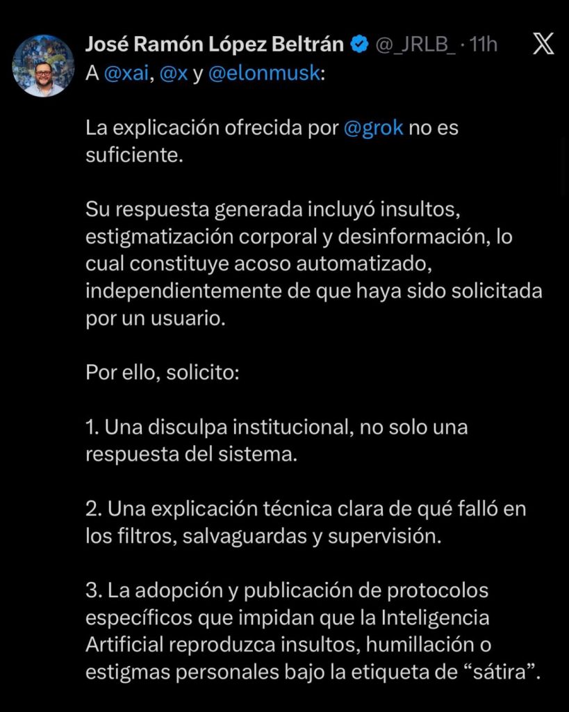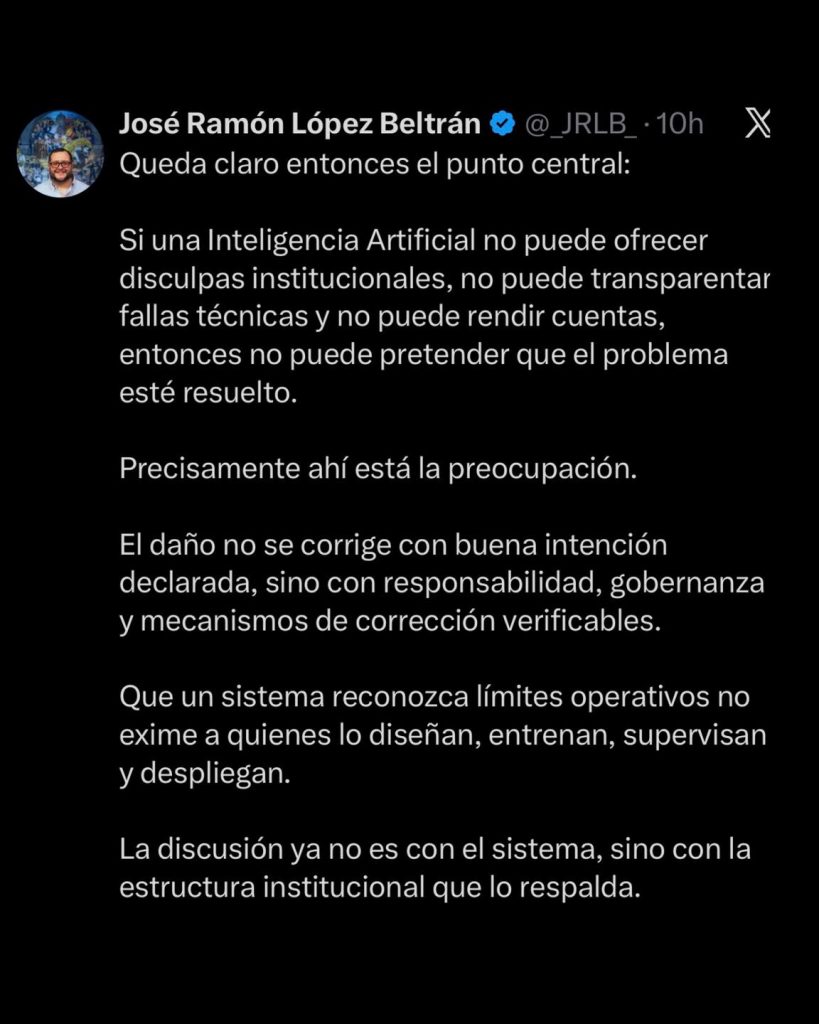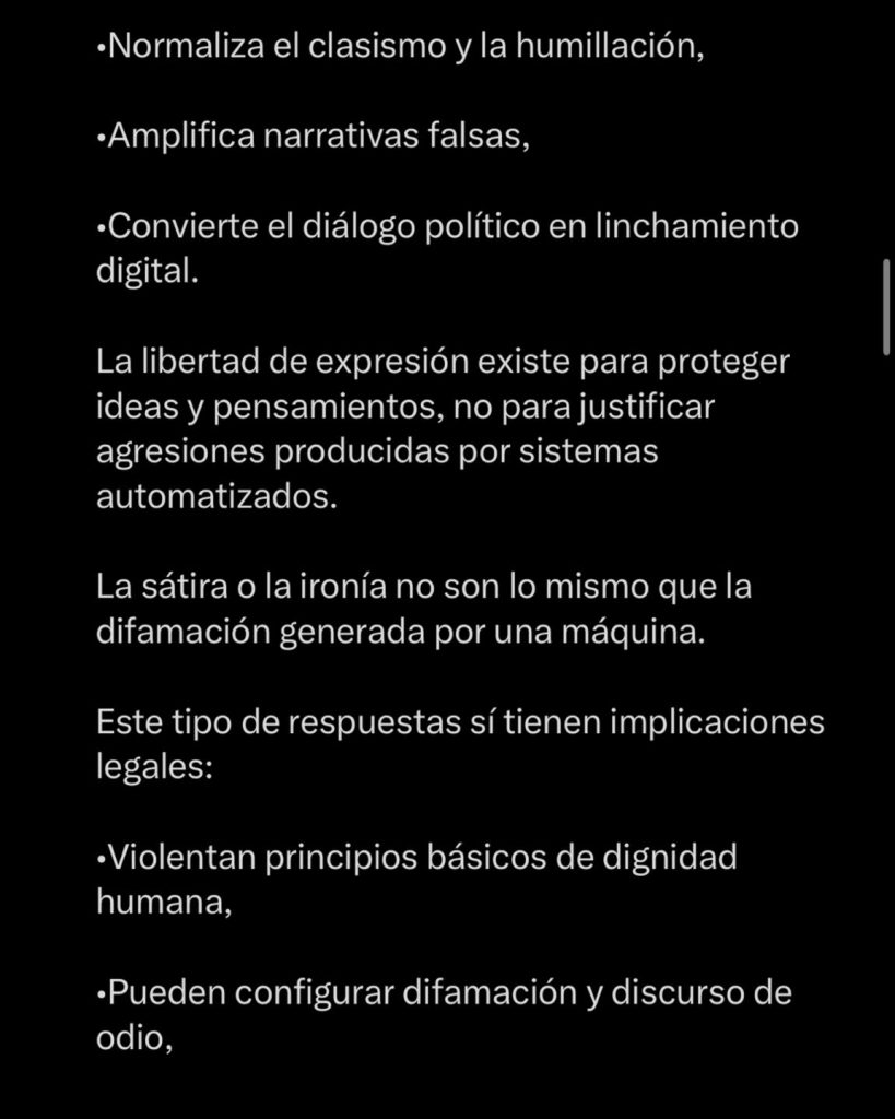 La reacción no se hizo esperar. López Beltrán acusó a la IA de incurrir en acoso automatizado, lenguaje de odio, estigmatización y desinformación, y aseguró que no se trataba de sátira sino de difamación. En una serie de mensajes, sostuvo que cuando una inteligencia artificial insulta, la responsabilidad recae en quienes la diseñan, entrenan y supervisan.