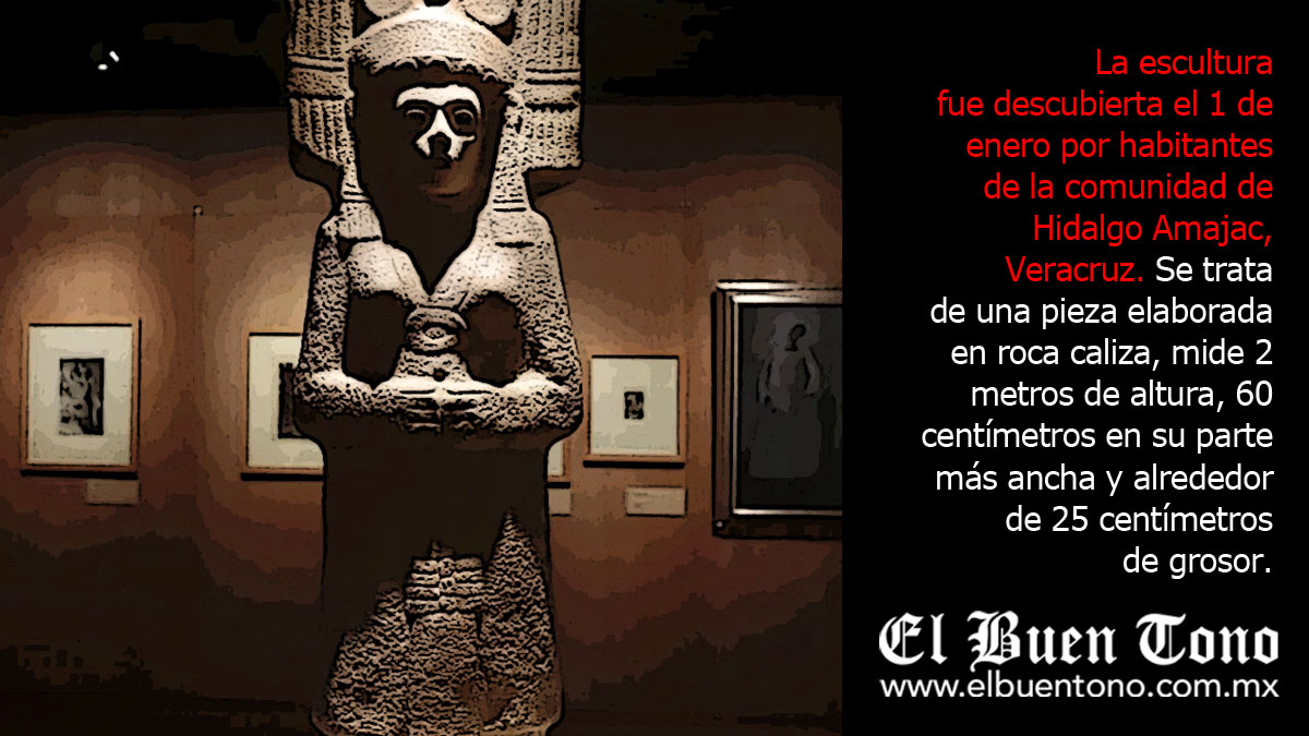 Se trata de una escultura que fue encontrada por habitantes de la comunidad de Hidalgo Amajac, Veracruz, que mide casi dos metros de altura y actualmente forma parte de la exposición La Grandeza de México, que se presenta en el Museo Nacional de Antropología con motivo de los 500 años de la caída de Tenochtitlán y el bicentenario de la consumación de Independencia.