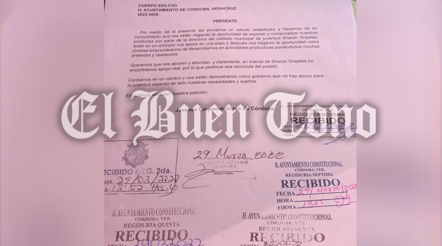 CÓRDOBA.- Jóvenes emprendedores, solicitaron por escrito la destitución de la directora del Instituto Municipal de la juventud, Sharon Grajales, pues aseguran que ha negado la oportunidad de exponer y comercializar productos, pese a que en un un principio los apoyó únicamente en una “Expo”, para después ponerles presuntos pretextos y obstáculos.