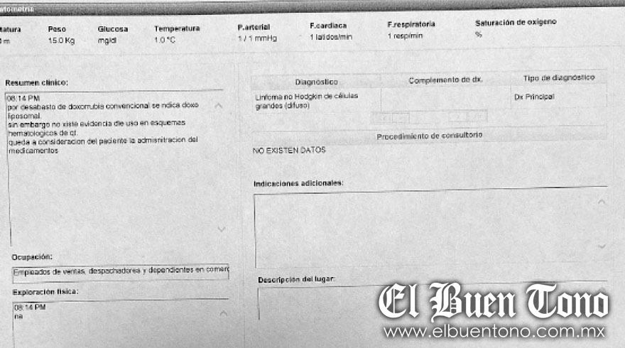 En específico comentaron el caso de un paciente diagnosticado con linfoma no Hodgkin de células grandes, el cual debe ser tratado con Doxorrubicina convencional, pero como no hay en existencia y además es negativa de almacén, aunado a la ignorancia, prepotencia y autoritarismo, fácilmente desde la oficina de representación del IMSS Veracruz Sur ordenan que le sea indicada por los médicos la Dexorrubicina liposomal, de la cual no existe evidencia científica que sirva para remitir los estragos de esta patología, obligando a los médicos especialistas a recetarla, pasando por encima de la autonomía y los criterios de estos especialistas, lo anterior plasmado en la Ley del Seguro Social y su contrato colectivo de trabajo vigente, los galenos se ven con la responsabilidad de explicarle a los pacientes que ese medicamento no les servirá de nada y que pudiera traerles consecuencias fatales, ya sea por la reacción a la fórmula o por que el padecimientos avanza por no tener la medicación correcta, de continuarse con estas prácticas sin ética, los médicos advierten muertes de derechohabientes por negligencia administrativa por parte de la médico general María Magdalena Chiquito Rivera; por otra parte, dejan en claro que ellos no serán responsables por los graves perjuicios que se ocasionen a los pacientes, «el objetivo principal de denunciar es en primer lugar por la salud de sus pacientes en el IMSS, segundo lugar, advertir que no permitirán que se les finque responsabilidad medical o penal y tercero señalar ante los derechohabientes a la titular del IMSS como responsable de los desenlaces fatales que su mal actuar ocasionen, y decirle a los afectados que las demandas ante arbitraje médico o civiles y penales las interpongan en contra de ella», remataron los médicos en la entrevista con El Buen Tono.
