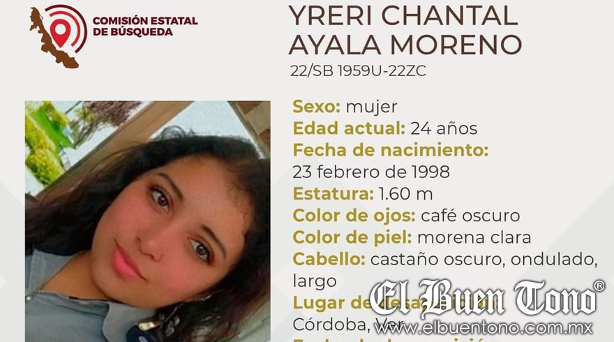 Córdoba, Ver.- Una joven de 24 años de edad, identificada como Yreri Chantal Ayala Moreno, se encuentra desaparecida desde el pasado 14 de noviembre.