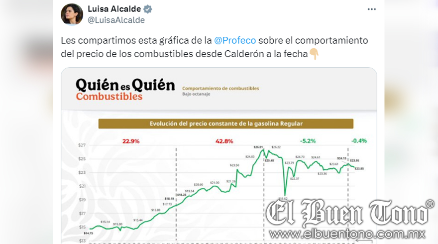 La respuesta de la presidenta de Morena, Luisa María Alcalde, fue contundente. A través de sus redes sociales, Alcalde recordó que el precio de la gasolina, en términos reales, es más barato ahora que durante los sexenios de Felipe Calderón y Enrique Peña Nieto. Además, señaló que los panistas parecen “muy nerviosos” por los esfuerzos de la Procuraduría Federal del Consumidor (Profeco), que ha señalado a gasolineras que venden combustible a precios más altos de lo normal. Alcalde sugirió que estos nervios podrían deberse a intereses de la industria.