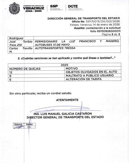 El oficio SSP/DGTE/DG/023/2026 revela que durante 2025 se atendieron 94 quejas, siendo las rutas San Román, Sabana Larga y 8 de Marzo algunas de las más señaladas. Al revisar la lista de permisionarios citados en dichas quejas, el nombre Tress aparece de manera persistente: Jesús David Tress Escamilla (operador de las rutas Sabana Larga, Dorados, Lentail, Palotal), Giovanna Tress (de Autobuses 8 de Marzo) y José Toribio Tress Zilli (de La Luz Francisco y Madero y Autobuses 13 de Mayo). Esta concentración de quejas en un mismo grupo familiar sugiere una red de influencia y control sobre numerosas rutas clave en la ciudad, un hecho que los usuarios perciben como un monopolio de facto que opera con impunidad.