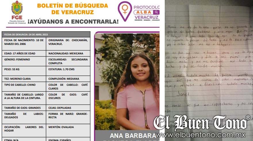 Ella fue vista por última vez en Chocamán el 4 de abril de este año, pero apenas el pasado martes se dio a conocer su desaparición y la Comisión Estatal de Búsqueda de Personas Desaparecidas emitió la ficha de búsqueda y como seña particular es de complexión regular, cejas pobladas y nariz chata.