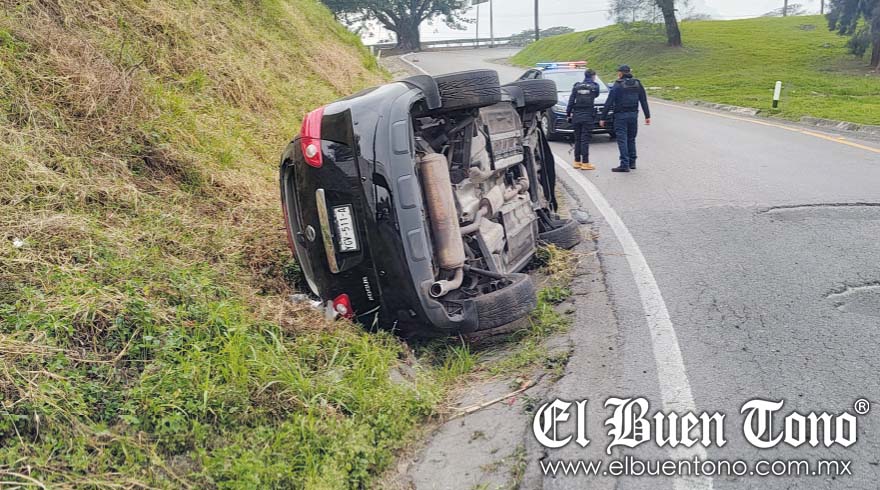 El exceso de velocidad al tomar la curva que conduce de Orizaba a Córdoba para unirse a la autopista provocó que el conductor perdiera el control, resultando en la volcadura del automóvil con las llantas de costado.