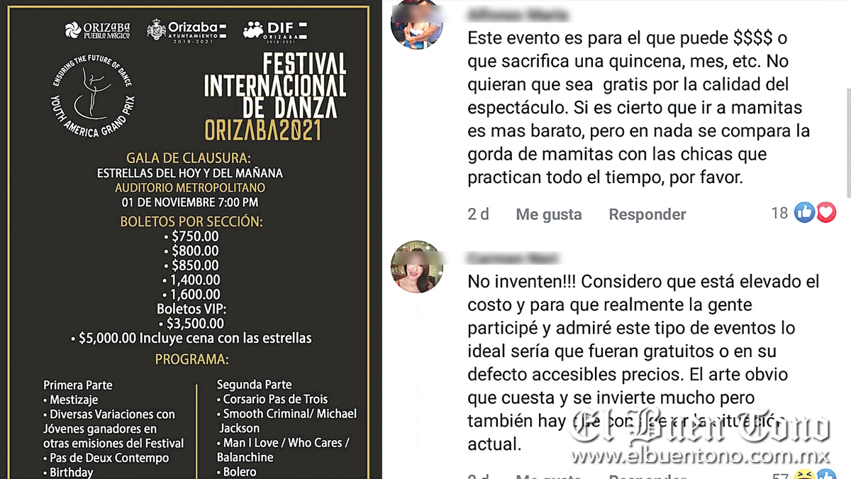 Orizaba.- En redes sociales orizabeños le reclaman al Alcalde lo caro de los accesos de entrada para la Gala de Clausura del Décimo Festival Internacional de Danza Orizaba 2021 en el Auditorio Metropolitano, el más económico es de 750 y el más caro de 5 mil pesos, señalan que los sueldos no son tan buenos como para invertir una semana de sueldo o mensualidad para asistir.