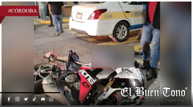 Córdoba, Ver.- Una pareja que viajaba en motocicleta resultó lesionada al chocar por alcance contra el taxi número CO-103, este domingo por la madrugada en la avenida 5 y calle 7.