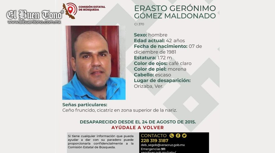 Orizaba. – A nueve años de la desaparición de Erasto Gerónimo Gómez Maldonado, de 42 años, la Comisión Estatal de Búsqueda a mantenido activo el boletín de emergencia para Localizarlo.