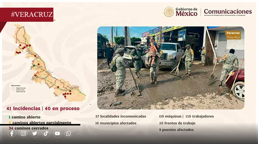 Durante la conferencia encabezada por la presidenta Claudia Sheinbaum Pardo, el titular de la SICT, Jesús Antonio Esteva Medina, detalló que actualmente hay 40 incidencias en proceso, un camino abierto, seis abiertos parcialmente y 34 cerrados.