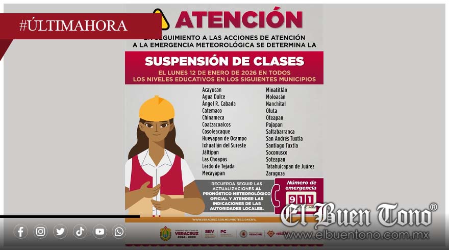 Ante el pronóstico de lluvias significativas para el sur del estado este lunes 12 de enero, el Comité Estatal de Emergencias ha decidido suspender las clases en todos los niveles educativos en múltiples municipios. La medida busca garantizar la seguridad de estudiantes y docentes ante posibles afectaciones por las precipitaciones.