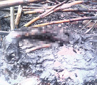A simple vista, se estableció que la víctima podría tener entre 2 y 3 semanas de muerto, y prácticamente se hallaba en estado de putrefacción cuando fue alcanzado por las llamas.