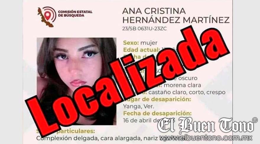 Córdoba.- La menor de 13 años de edad, identificada como Ana Cristina Hernández Martínez, que fue reportada como desaparecida desde el día de ayer domingo 16.l, ya fue localizada. La Comisión Estatal de Búsqueda de Personas desaparecidas, ya emitió su boletín y confirmó su localización.