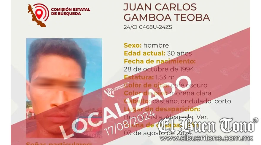 Veracruz.- La Comisión Estatal de Búsqueda de Veracruz ha confirmado la localización de Juan Carlos Gamboa Teoba, un hombre de 30 años reportado como desaparecido desde el 3 de agosto en Alvarado, Veracruz. Gamboa Teoba fue hallado con vida el 17 de agosto, aunque la condición exacta de su salud y las circunstancias de su desaparición permanecen inciertas.
