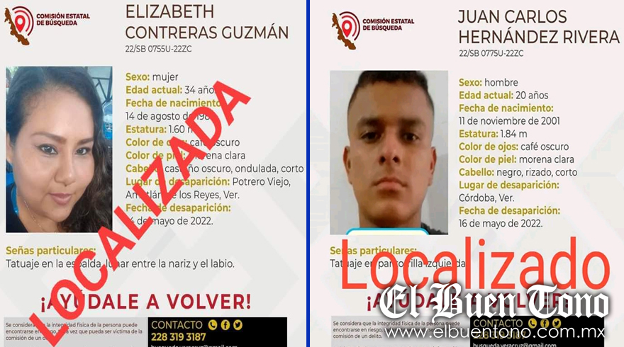 Córdoba.- Una mujer identifica como Elizabeth Contreras Guzmán quien desapareció en Potrero Viejo, municipio de Amatlán así como un joven de nombre Juan Carlos Hernández Rivera  el cual fue visto por última vez en esta ciudad de Córdoba, y eran buscados a través de la Comisión Estatal de búsqueda de personas desaparecidas, finalmente fueron localizados.