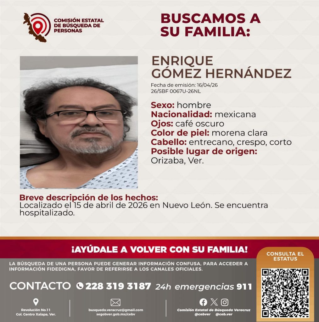 Orizaba, Veracruz.– Autoridades estatales activaron un protocolo de localización para dar con los familiares de un hombre identificado como Enrique Gómez Hernández, quien fue ubicado en el estado de Nuevo León y actualmente permanece hospitalizado bajo observación médica.