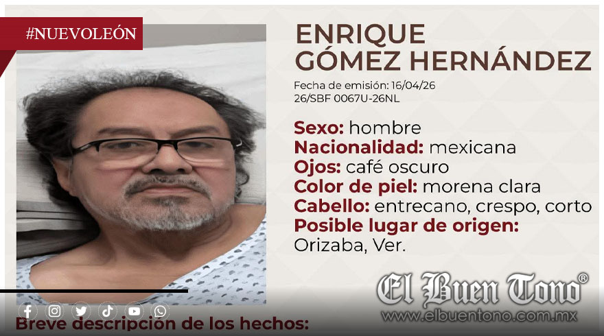 Según la ficha difundida, Enrique Gómez Hernández es de nacionalidad mexicana, presenta tez morena clara, ojos café oscuro y cabello entrecano, corto y crespo. Como seña particular, utiliza lentes. De manera preliminar, se presume que podría ser originario del municipio de Orizaba, en la región de las Altas Montañas.