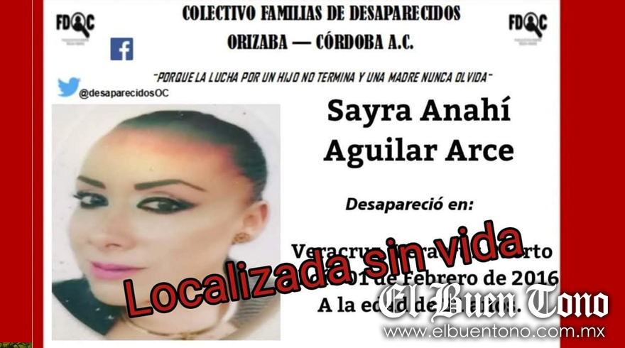 Orizaba.- El día de hoy, se dio a conocer que la abogada rioblanquense y prima del ex alcalde Raúl Vera Aguilar, Sayra Anahí Aguilar Arce, quien desapareció desde el pasado mes de febrero de 2016 junto con otro abogado, fue localizada sin vida y sus restos ya fueron entregados a sus familiares.