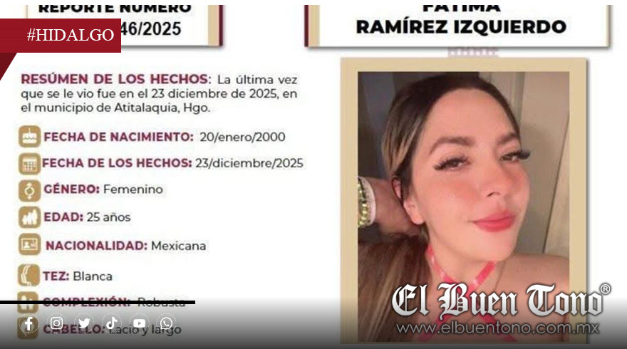 La víctima fue identificada como Fátima Ramírez Izquierdo, quien salió de su domicilio el 23 de diciembre y ya no regresó. Tras su desaparición, familiares iniciaron una intensa búsqueda en la región, además de difundir su ficha en redes sociales con la esperanza de obtener información sobre su paradero.
