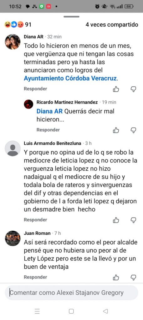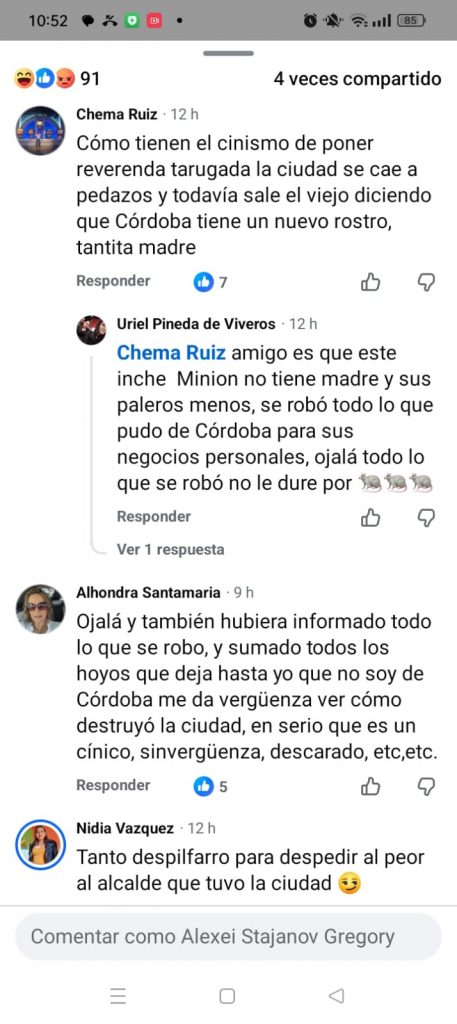 “Cómo tienen el cinismo de poner reverenda tarugada, la ciudad se cae a pedazos y todavía sale el viejo diciendo que Córdoba tiene un nuevo rostro, tantita madre”, escribió Chema Ruiz, en un comentario que acumuló múltiples respuestas de apoyo.