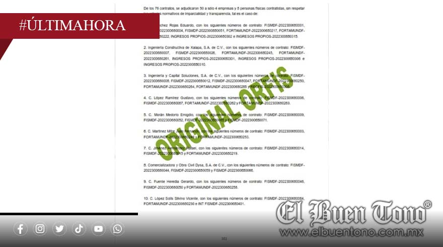 Según documentos oficiales revisados por este medio, al menos 4 empresas y 8 personas físicas han obtenido contratos de manera recurrente durante la administración de Rosales, en un esquema que el Órgano de Fiscalización Superior (ORFIS) ha señalado por irregularidades en el manejo de recursos públicos.