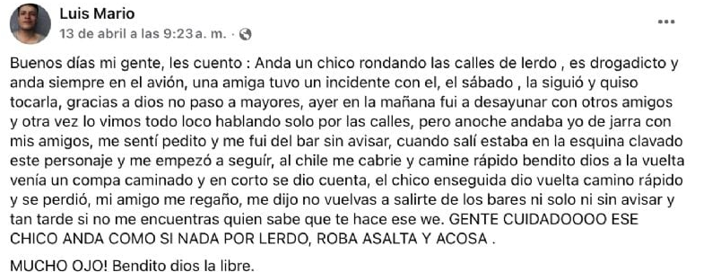 De acuerdo con su propia publicación, el joven había alertado previamente que un sujeto lo perseguía, además de señalar que también habría intentado acosar a una de sus amigas. En sus mensajes pidió a la población extremar precauciones y advirtió sobre la presencia del individuo.