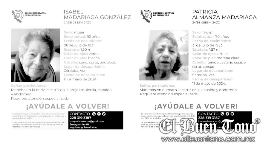 Para cualquier información que pueda servir para localizarlas sanas y salvas, la CEBPD ha puesto a disposición los teléfonos 2283193187 y emergencias 911, así como el correo busqueda.veracruz@gmail.com y el sitio web segobver.com.gob.mx/cebv/.
