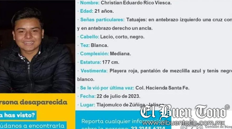 Tlajomulco, Jalisco.- La tarde del 1 de mayo, el cuerpo de Christian Eduardo Rico Viesca, de 21 años, fue localizado después de casi un año de su desaparición. Rico Viesca fue visto por última vez el 22 de julio de 2023 en la colonia Santa Fe, en Tlajomulco.