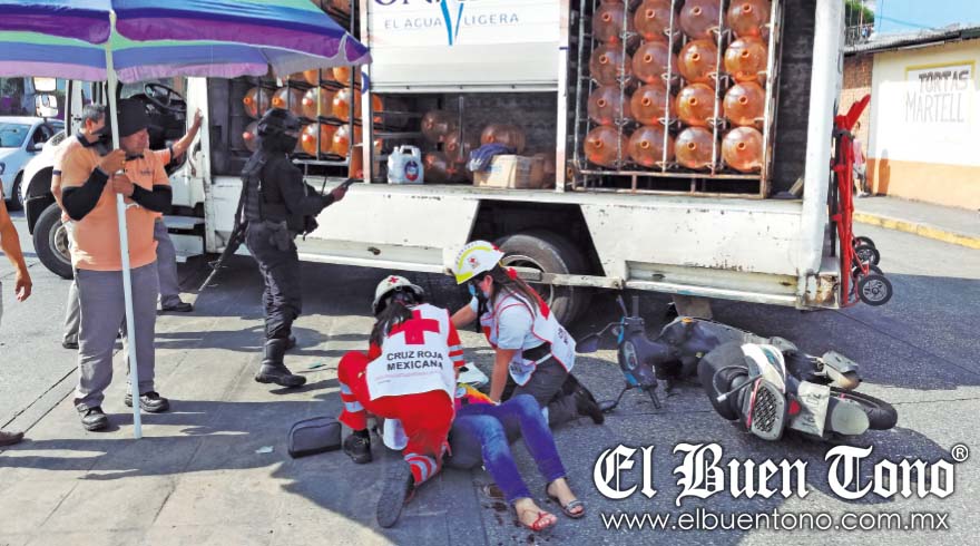 Córdoba.- Una mamá y su hijo que viajaban en una motoneta, resultaron lesionados al chocar contra un camión repartidor de agua que se les cruzó en el fraccionamiento Infonavit San Román.