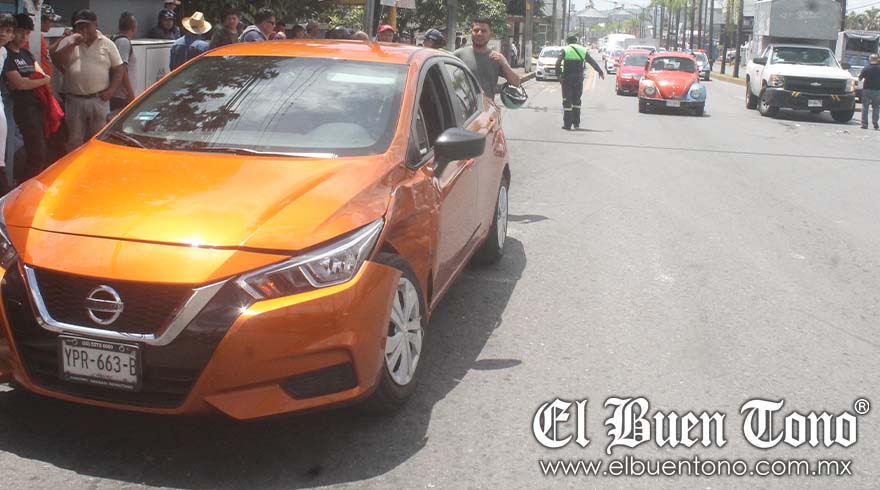 Presuntamente aceleró y chocó contra la camioneta blanca que subía por el bulevar. Ambos vehículos quedaron dañados, los conductores resultaron ilesos y dieron aviso a las aseguradoras, mientras testigos pidieron el apoyo de Tránsito.