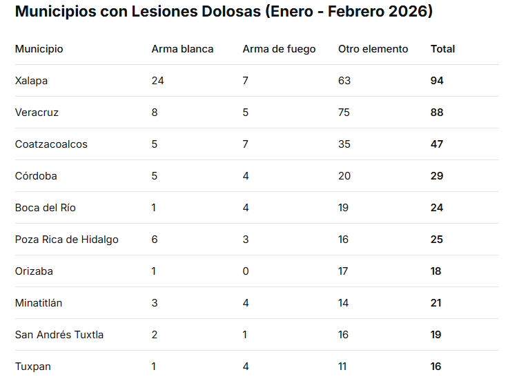 En el delito de lesiones dolosas, Córdoba se mantuvo consistentemente entre los cinco municipios con más casos: Enero con 16 lesiones, cuarto lugar estatal; febrero 13 lesiones, quinto lugar estatal.