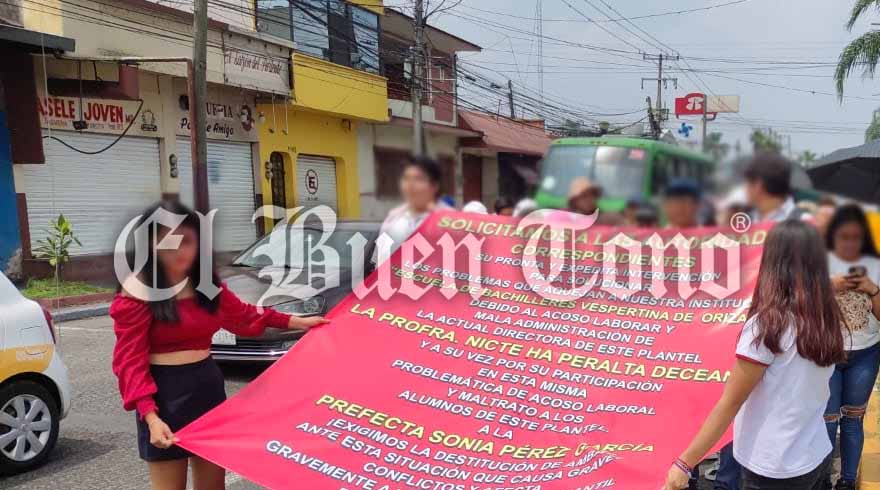 Orizaba.- Estudiantes de la Escuela de Bachilleres Vespertina de Orizaba (EBVO), salieron a las calles a marchar para exigir una solución al problema que mantiene a la escuela cerrada desde el 29 de mayo y está ocasionando retraso en la educación.