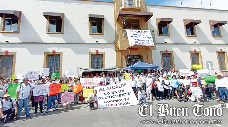 De blanco y guinda empleados de confianza, acompañados de amigos, se manifestaron para exigir la liberación del Edil, y regresaron al plantón en el Palacio Municipal, bloqueado con cadenas y candados.