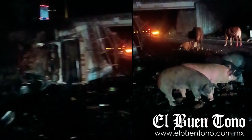 Maltrata.- Un camión cargado de marranos volcó sobre la autopista Puebla-Córdoba en el tramo Esperanza – Ciudad Mendoza justo a la altura de las cumbres de Maltrata.