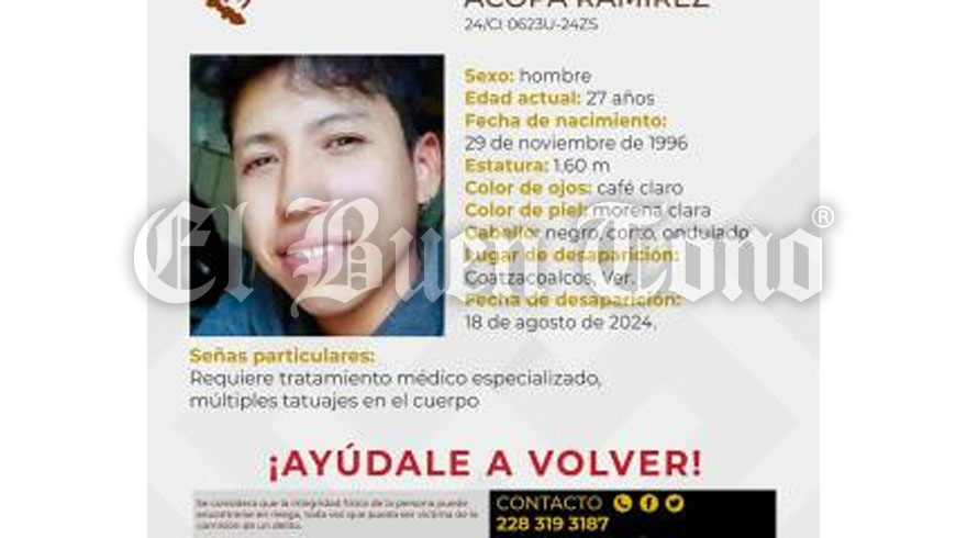 Acopa Ramírez requiere de atención médica especializada, lo que incrementa la preocupación de sus familiares, quienes desconocen las circunstancias de su desaparición, ocurrida el 18 de agosto. De acuerdo con el boletín 24/CI-0623U-24ZS, el joven es de complexión baja y de piel morena clara, con ojos café claros y cabello corto, negro y ondulado. Además, cuenta con múltiples tatuajes en el cuerpo como seña particular.