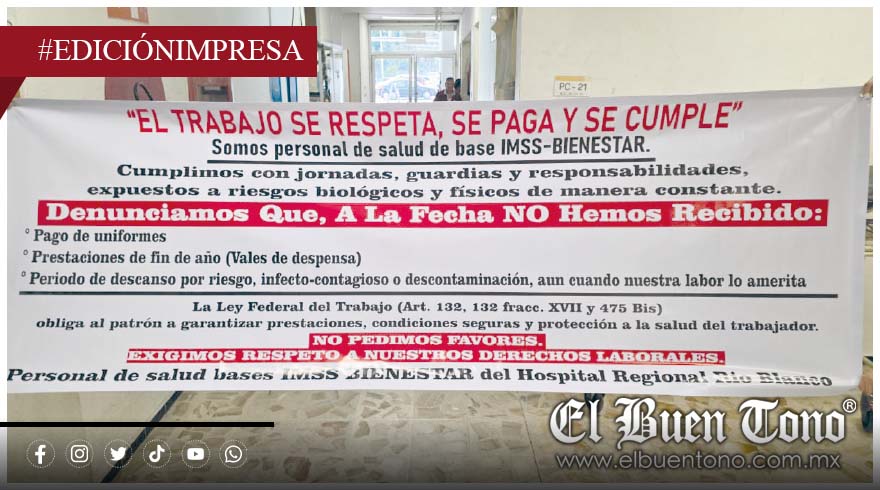 Río Blanco.- Trabajadores de la salud del programa IMSS-Bienestar desplegaron ayer una manta de protesta en el puente peatonal frente al Hospital Bienestar de este municipio, exigen el respeto a sus derechos laborales, porque continúan siendo vulnerados a pesar de tener su base.