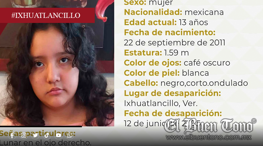 Ixhuatlancillo, Ver.- La menor Roberta Anyer Palestino Avelino, de 13 años de edad, fue reportada como desaparecida desde el pasado 12 de junio, por lo que sus familiares solicitan el apoyo de las autoridades y de la ciudadanía para localizarla.