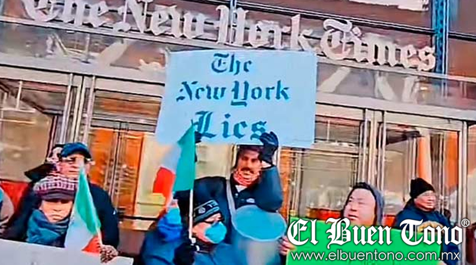 EEUU.- La mañana de este domingo, decenas de mexicanos residentes en Estados Unidos se congregaron frente a las oficinas del diario The New York Times (NYT) en Midtown Manhattan para expresar su apoyo al presidente Andrés Manuel López Obrador y manifestar su descontento por un reportaje que vincula a aliados del mandatario con el narcotráfico.