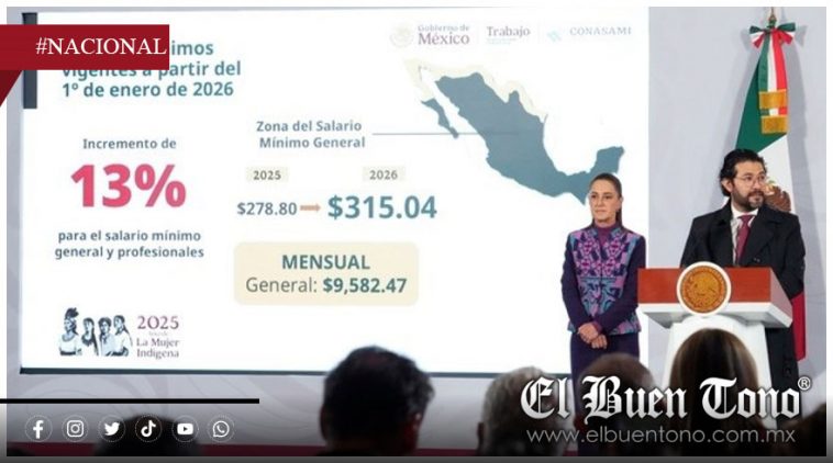 Nacional.- El Gobierno de México informó este miércoles que, a partir del 1 de enero del próximo año, el salario mínimo aumentará 13 por ciento, alcanzando los 315.04 pesos diarios, equivalente a aproximadamente 15.75 dólares. El anuncio fue realizado por el secretario del Trabajo, Marath Bolaños, durante la conferencia presidencial matutina, quien también reveló que se enviará al Congreso un proyecto de reforma para reducir de manera progresiva la jornada laboral semanal de 48 a 40 horas.