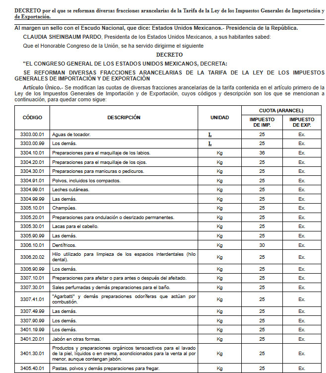 El decreto fue publicado este lunes en el Diario Oficial de la Federación y contempla modificaciones a diversas fracciones arancelarias de la Ley de los Impuestos Generales de Importación y Exportación, con el objetivo de ajustar las condiciones de entrada de productos provenientes de mercados sin acuerdos comerciales con el país.